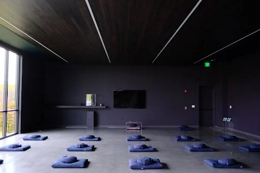 The Main Hall, designed to reduce outside noise, includes large indoor spaces for sitting and walking meditation, plus a lower-level classroom and kitchenette. Both levels open onto an outdoor-style zen garden.