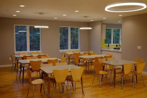 The Dormitory Hall, located behind the Main Hall, offers sleeping quarters on all levels, with a kitchen and dining area on the first floor and a laundry room in the basement.