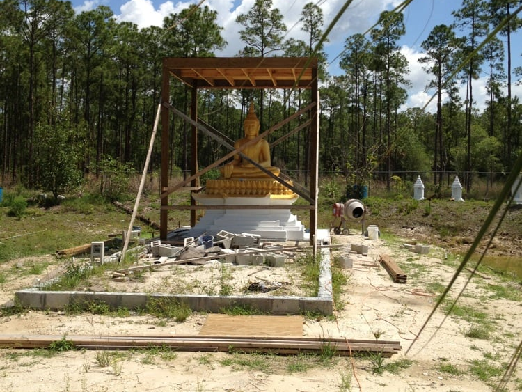 During the early years of Wat Lao Dhammavanno, the temple in which rituals were held was temporary due to a lack of money. In 2012, construction began on an outdoor Buddha shrine next to a pond. Eventually, a large hall was also created for events to be held in.