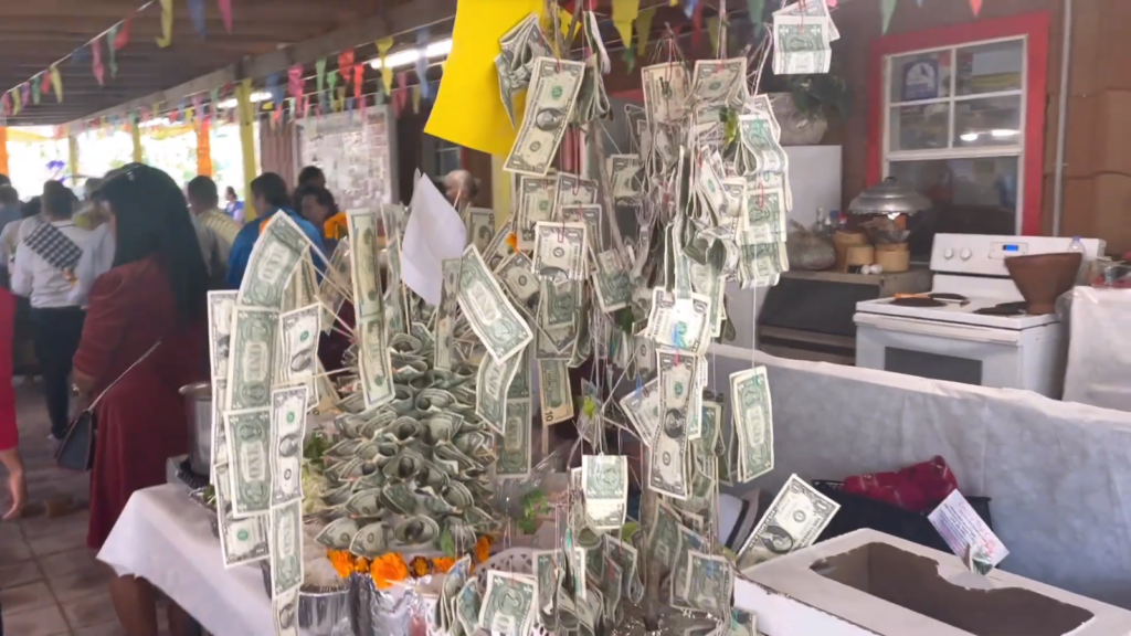 After lunch is eaten, there is music and dancing, followed by a small parade that loops around the premises three times. Finally, people return inside to place larger offerings for the monks called money trees. These offerings are cash donations arranged and decorated to look like small flowering plants or miniature trees, with the bank notes resembling the leaves.