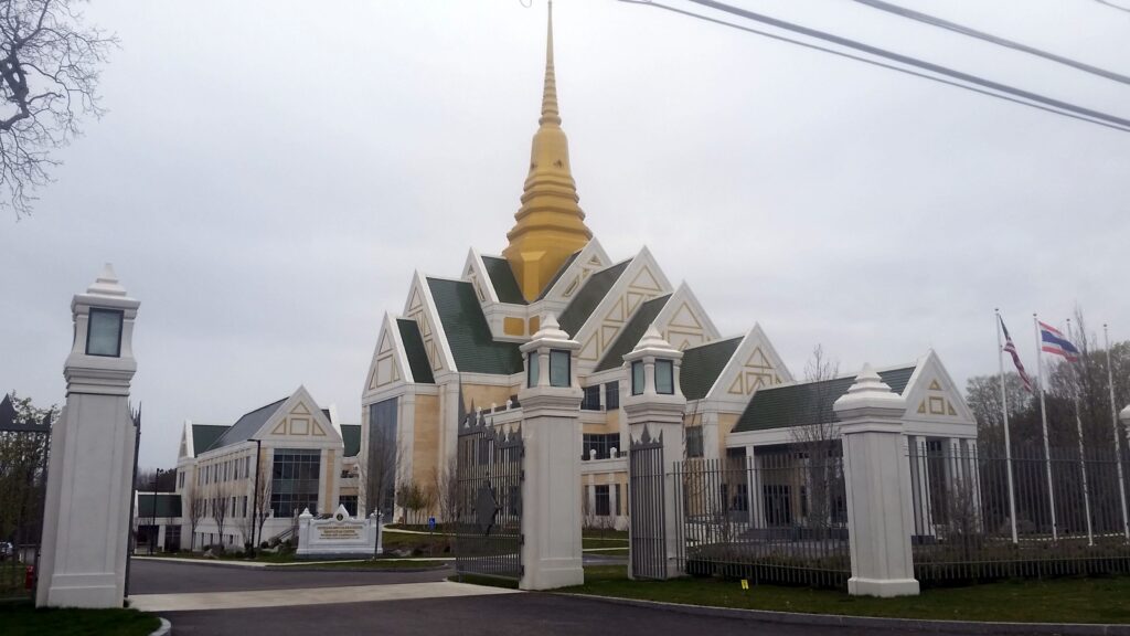 Wat Nawamintararachutis or วัดนวมินทรราชูทิศ located on Raynham, Massachusetts, is one of the largest temples outside of Thailand which aims to serve as a major spiritual and cultural center for Thai-American communities around and in New England. The temple was built in honor of King Bhumibol Adulyadej (Rama IX), it combines modern designs with traditional Thai architecture that creates a tranquil environment for cultural learning, meditation, and worship. Wat Nawamintararachutis not only offers religious practices, but they offer programs teaching Thai language, music, dance, and community service, allowing for a vibrant cultural lifestyle where visitors can experience both Buddhist teachings and living Thai heritages.